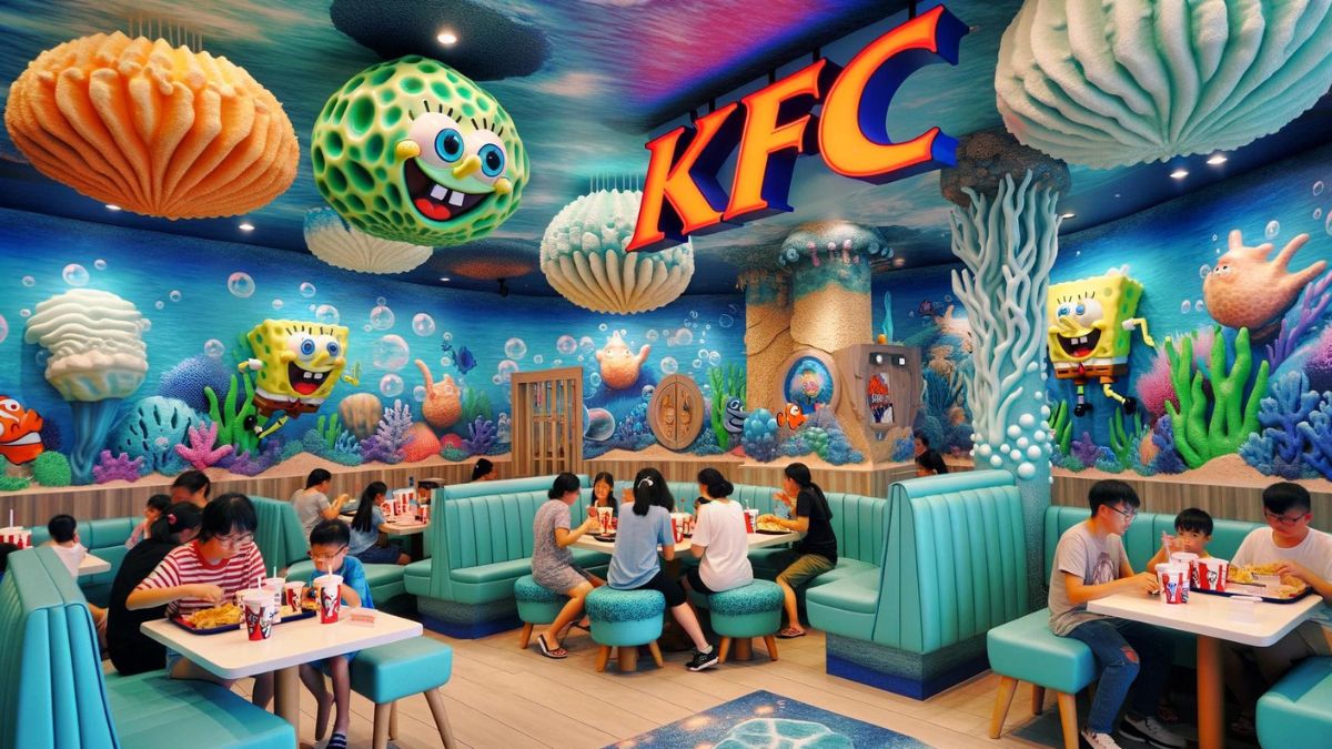 Kentucky Fried Chicken (KFC) creó una sucursal con temática de Bob Esponja para celebrar el 25 aniversario del famoso personaje animado conocido por vivir en el mar en una piña