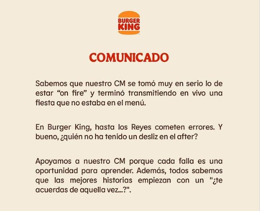 El Community Manager (CM) de Burger King Ecuador, es decir la persona encargada de manejar las redes sociales de la empresa, salió de fiesta y por error hizo un en vivo en la cuenta oficial de la empresa, en vez de hacerlo desde su cuenta personal.